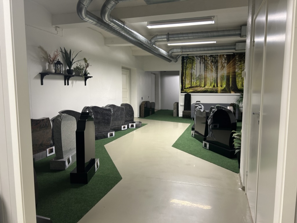 Vi har stor slitasje på gulvene hos oss pga.hard bruk med gravstein som kjøres og flyttes. Det var derfor tida for nytt lag med gulvmaling. Vi har også malt veggene og prøvd oss med en fototapet på veggen.